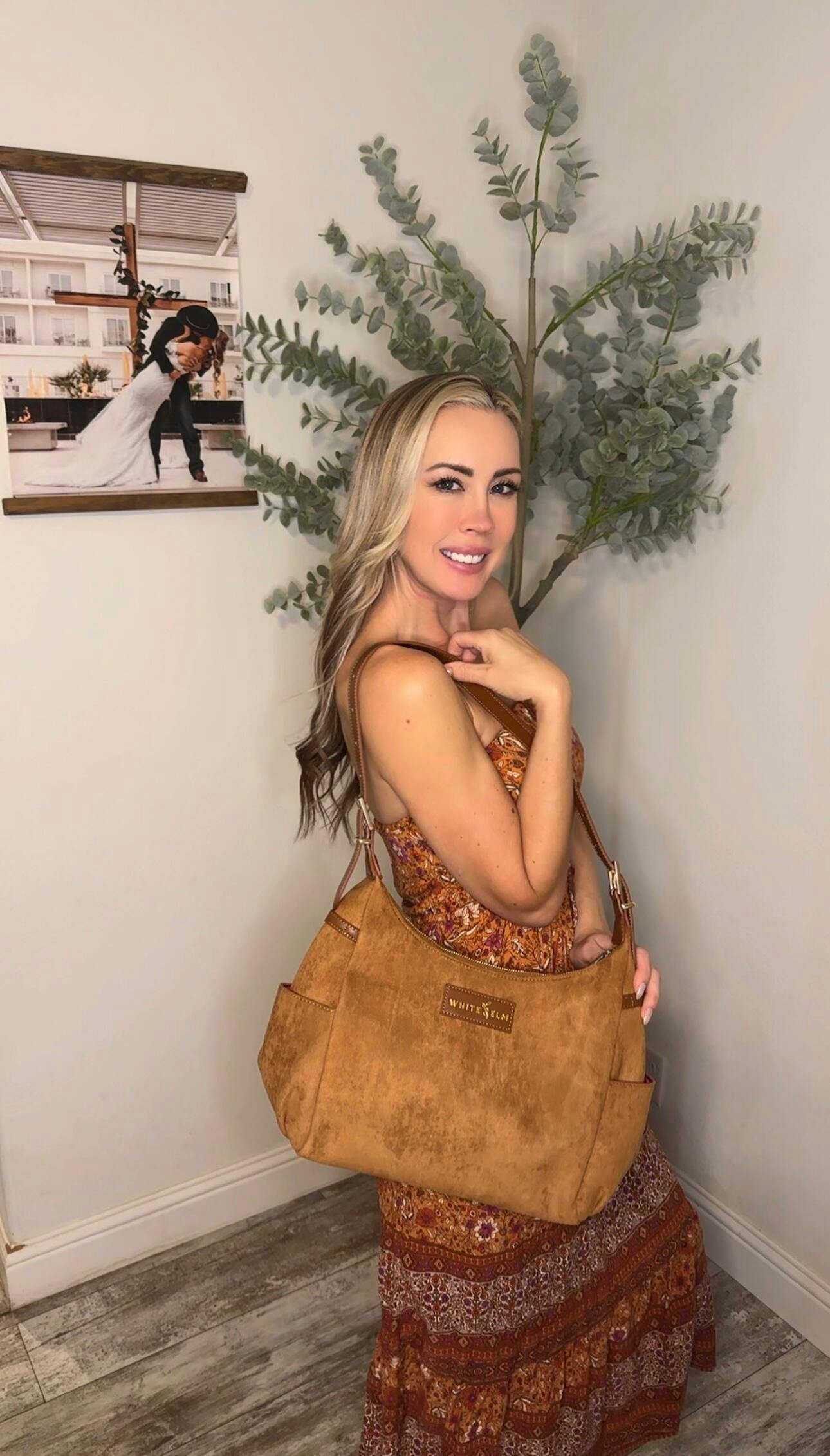 Crafted from premium vegan leather with a soft, slouchy yet structured silhouette, the Camille features a secure top zipper closure and a beautifully organized interior. Inside, you’ll find six interior pockets, including a zippered compartment, four trimmed slip pockets, a dedicated pen pocket, and a built-in key leash to keep your essentials in place. An exterior magnetic snap phone pocket provides quick, easy access to your device, while the two exterior side pockets are perfectly sized for your drinks.
